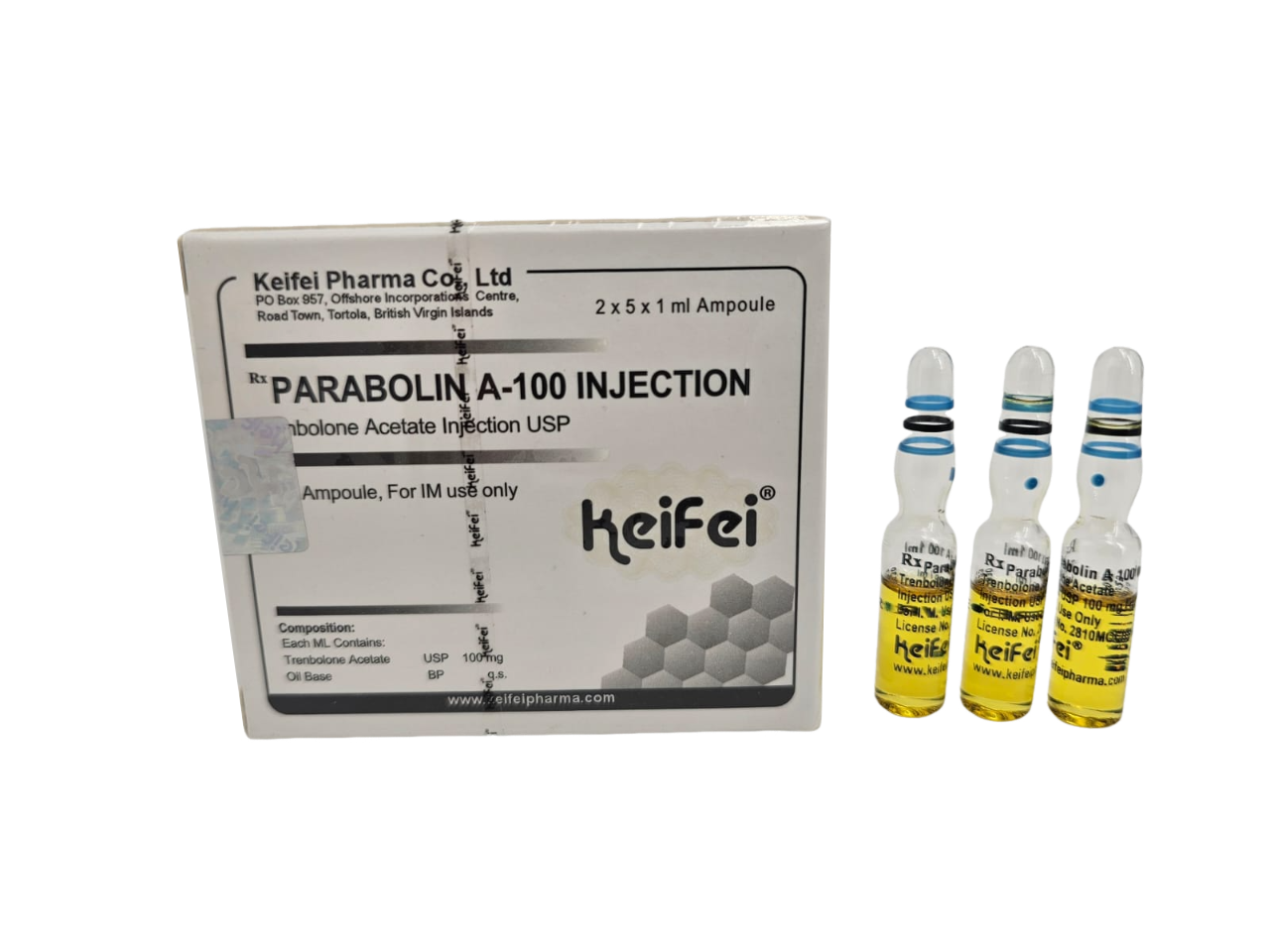 1ml single dose ampoule x Trenbolone Acetate 100mg/ml. Each ampoule imprinted with 3 rings on top blue, black, blue with a blue dot below. All wording is imprinted. Pack in 10 ampoules of 5 ampoules per tray x 2 in plastics insert with Keifei® imprint on it. The outer box contains 100 ampoules of 10 inner boxes of 10amps in white and black box. Each inner box pack of 10 ampoules come with 1 set of QR authentication codes paste on each inner box.
